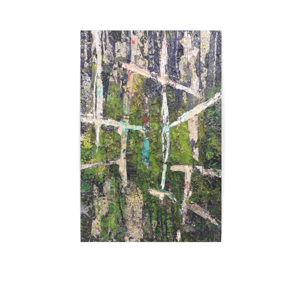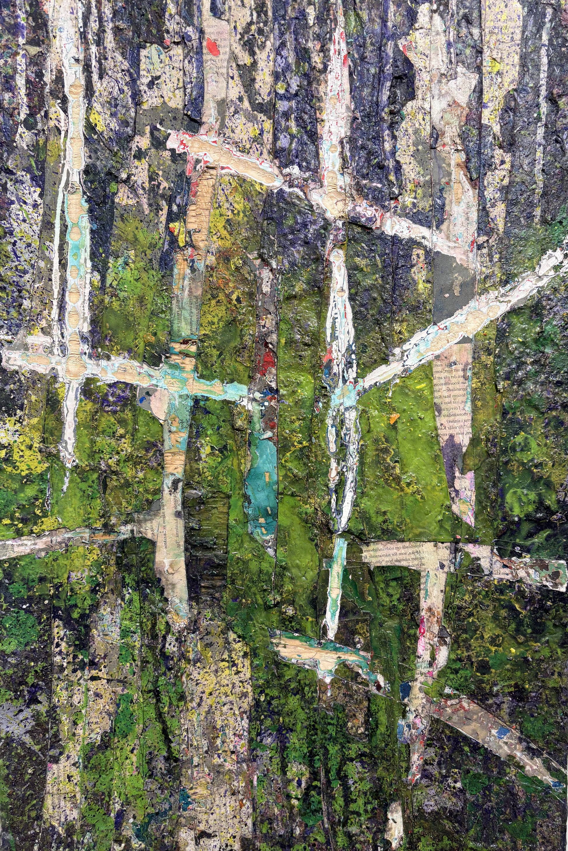 ÖVRIG INFO: ALL KÄNNER COLLAGE SOM TEKNIK, ETT EXEMPEL AV EN KÄND COLLAGIST ÄR KURT SCHWITTERS. DÉCOLLAGE ÄR ETT RELATERAT TEKNIK BASERAT PÅ BORTTAGANDET AV LAGER, DÄR BILDER AVSLÖJAS ISTÄLLET FÖR ATT BYGGAS. SOM EN EN AV TEKNIKENS GRUNDARE, MIMO ROTELLAS AFFISCHBASERADE DÉCOLLAGEVERK TRÄDDE FRAM I BÖRJAN PÅ 1950-TALET. NÄR BATES VAR TJUGO ÅR GAMMAL BESÖKTE HAN VATIKANMUSEET I ROM DÄR HAN FICK SE ATLASGLOBER SOM GJORDES AV PAPPER, LIM OCH GESSO. DE KASTADE DEN DÅKÄNDA VÄRLDEN OCH AVSLÖJADE LATINSKA TEXTER UNDERÅT, OCH HUR YTAN OCH DE UNDERLIGGANDE LAGREN ENADES LÄMNADE ETT KRAFTIGT INTRYCK PÅ BATES. HAN HAR NYLIGEN SKAPAT EN SERIE DÉCOLLAGEVERK BYGGT PÅ COLLAGE, FÄRG OCH LIM DÄR TEXTSNITTAR UR BÖCKER SOM BATES HAR LÄST BLIR AVSLÖJADE I ETT SPÄNNANDE EXPOSÉ.